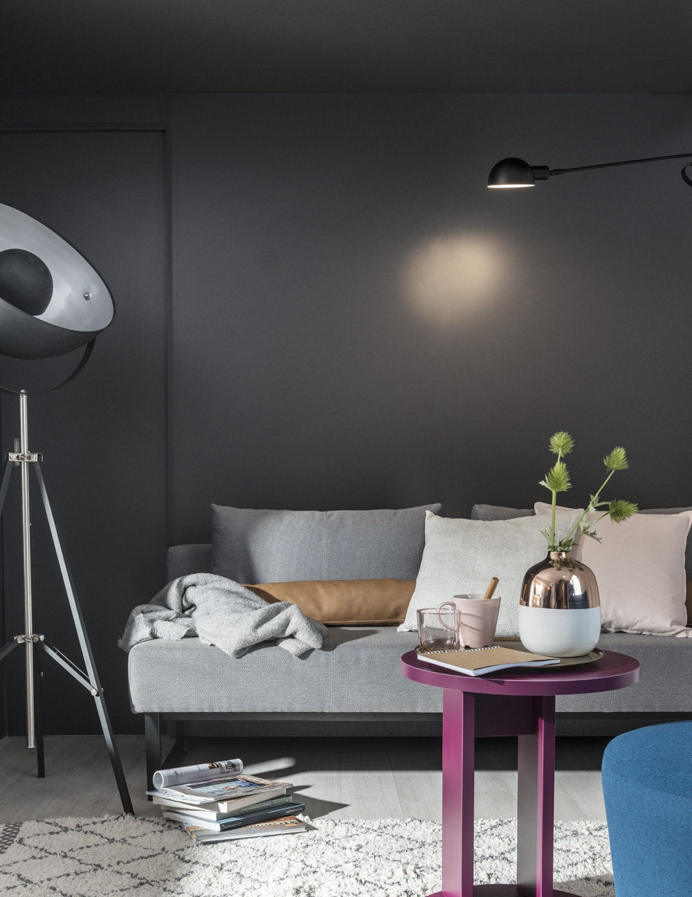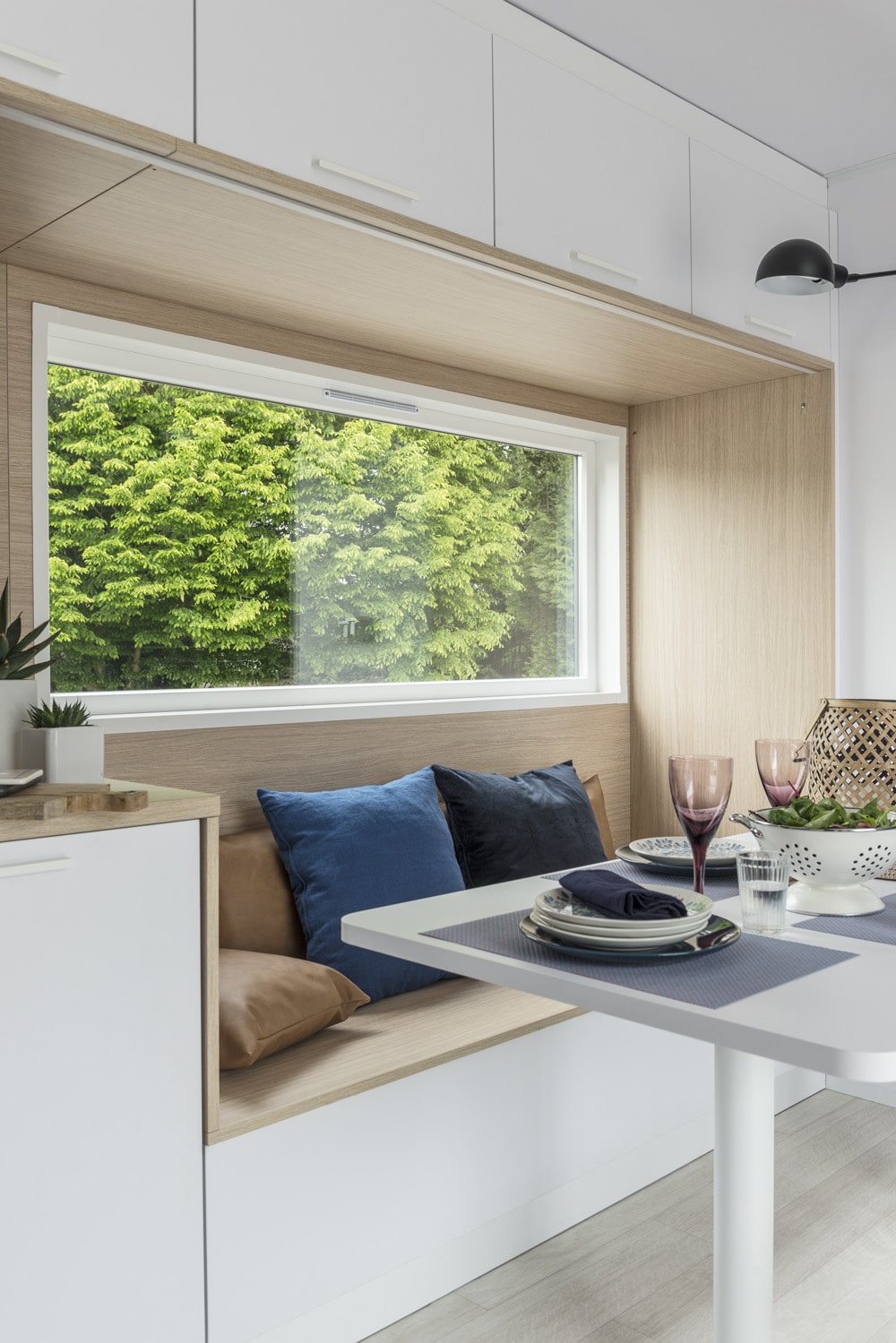 Para el salón nos centramos en el contraste del antracita de la pared con el gris claro del sofá convertible en cama. Para las comidas, una mesa blanca se ubica frente a un banco incorporado y sillas completan el look. Este sistema de asientos móviles en la terraza invita a la convivencia y al mismo tiempo es práctico.