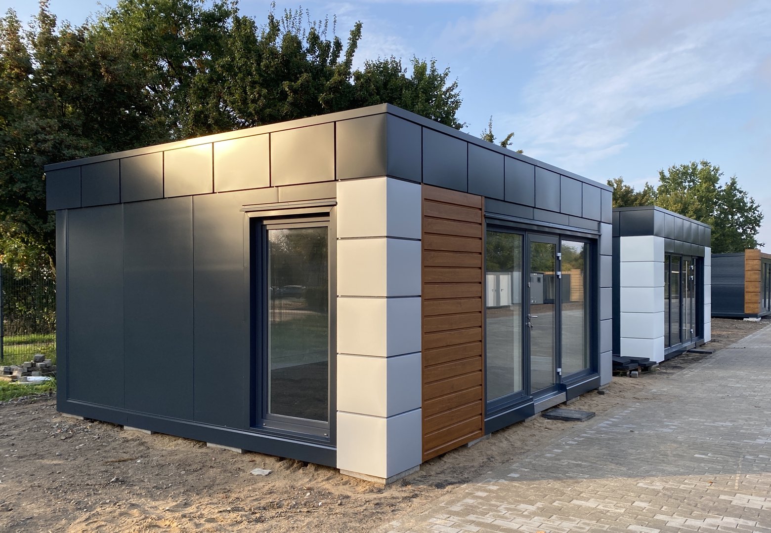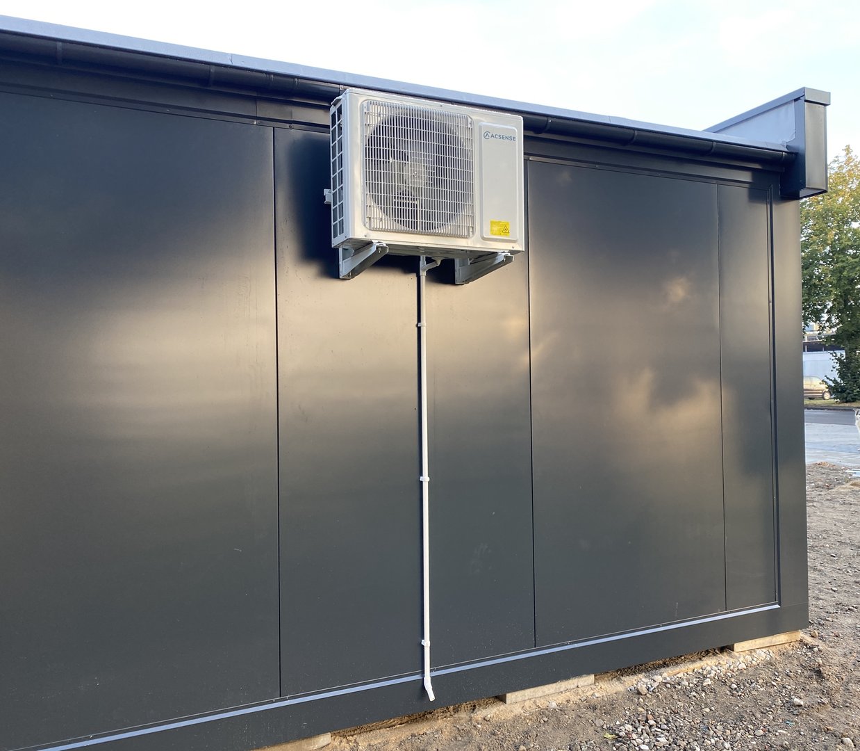 El contenedor de oficina está formado por elementos sándwich con un núcleo de poliestireno de 150 mm de espesor y un suelo aislante de 120 mm de espesor.
