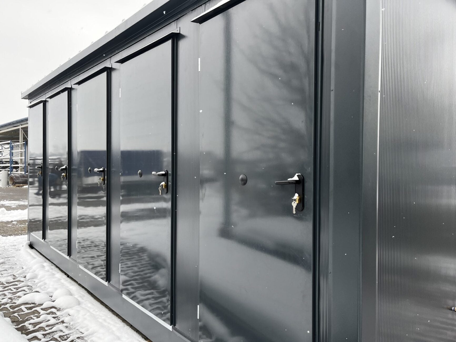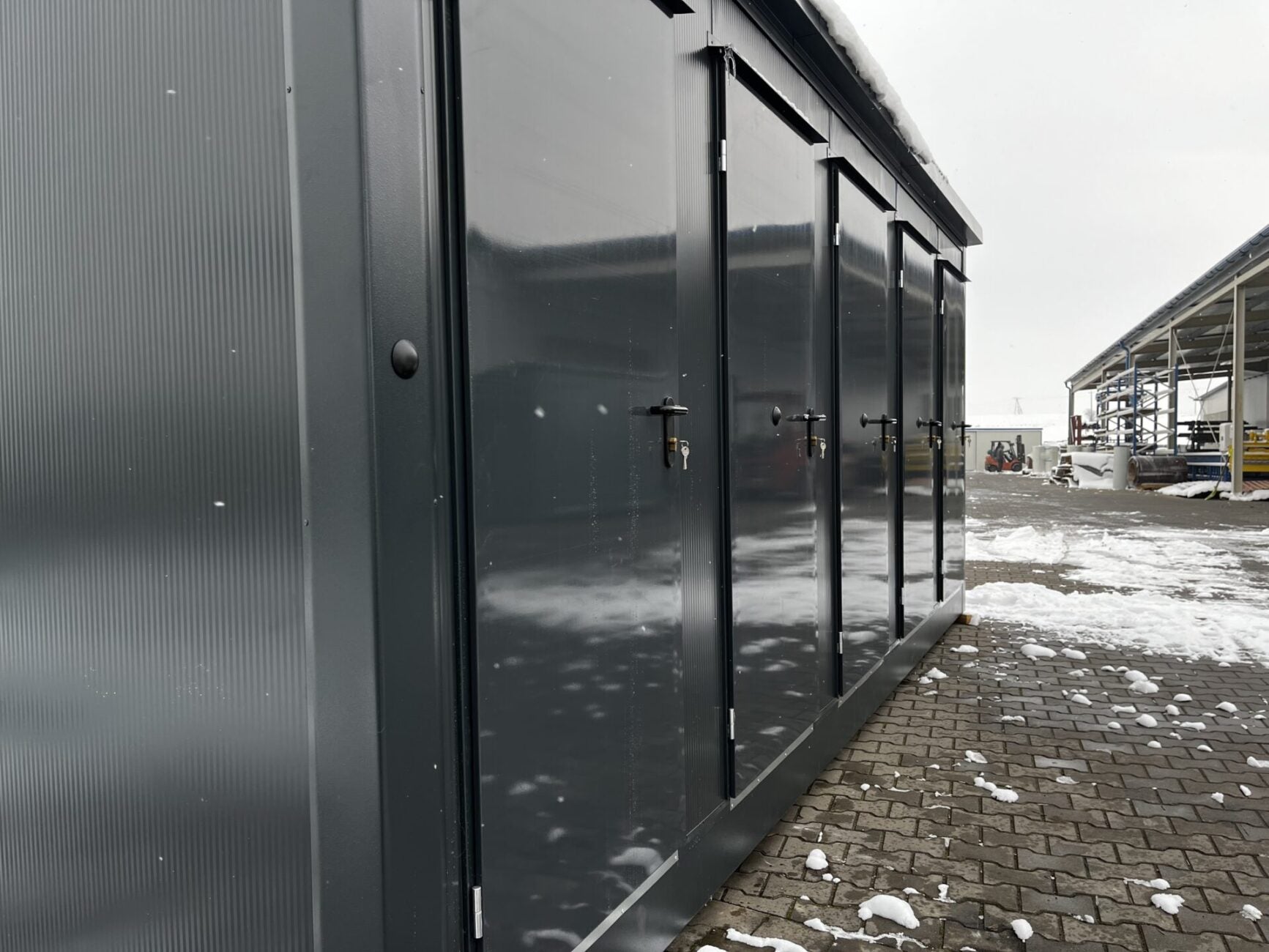 El contenedor contiene 10 cuartos sanitarios separados con WC compactos, cada uno con entrada independiente, puertas ZK ISO Hormann de 800 mm x 2000 mm.