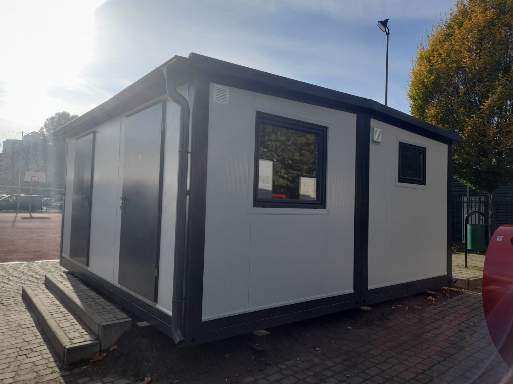 Contenedor sanitario modular de 5 m x 5 m, combinado con dos módulos completos de 5,00 m x 2,50 m CE.